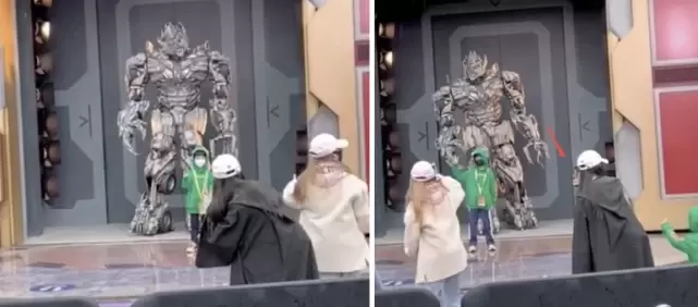 baby和机器人威震天合影的时候,小海绵在下面看着。后面baby鼓励小海绵上台去合影,小海绵勇敢站上去了,baby远程教儿子摆姿势,伸出手让小海绵比耶,小海绵立马照做,伸出小手指超可爱。拍完照片,baby招手示意儿子下台,小海绵则朝着妈妈走来,baby顺手把儿子牵过来,母子互动超有爱。