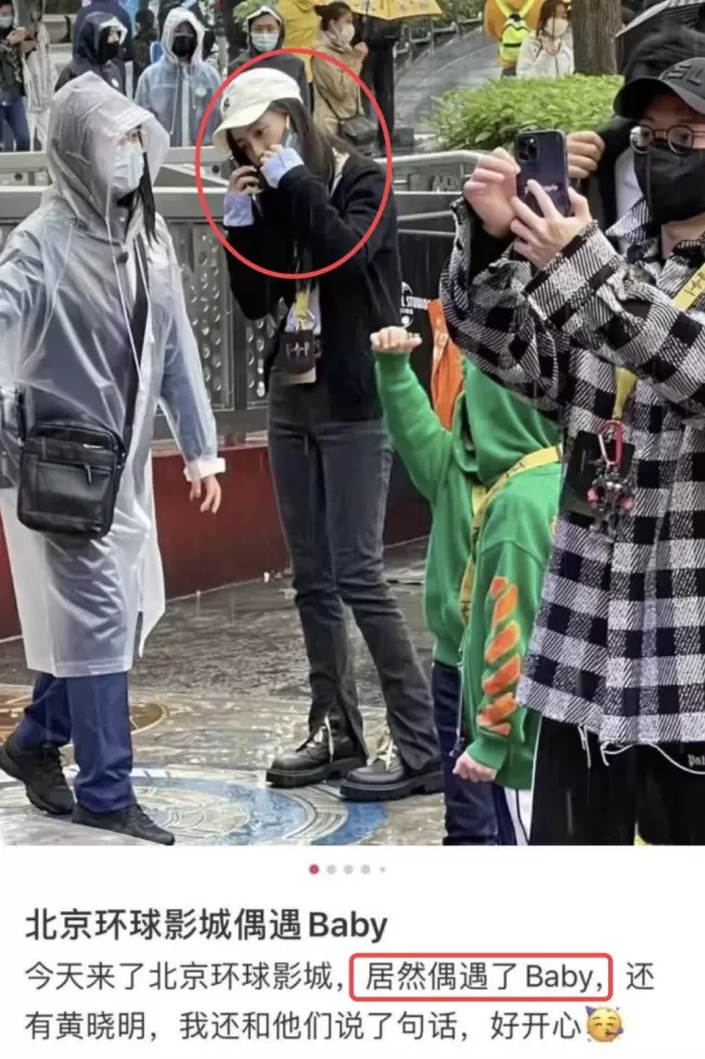 网友晒出偶遇照,图中,baby披着长发,带着棒球帽,正拿着手机在通话。baby虽然戴了口罩,但通话时露除了鼻子,可以清晰看到她的相貌,那双眼睛是baby没错了。