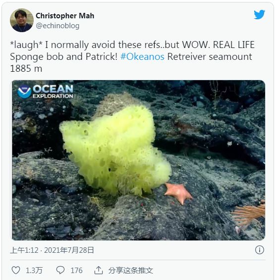 探险队发现的海棉很可能是一种叫做大球星的物种,粉红色的海星则是派大星角色的灵感来源。当然,海绵宝宝的形状显然像一块塑料清洁海绵,他是长方形的,但真正的深海海绵呢,它们的形状几乎是超现实的,大多都是这种奇异的、疯狂的形状。