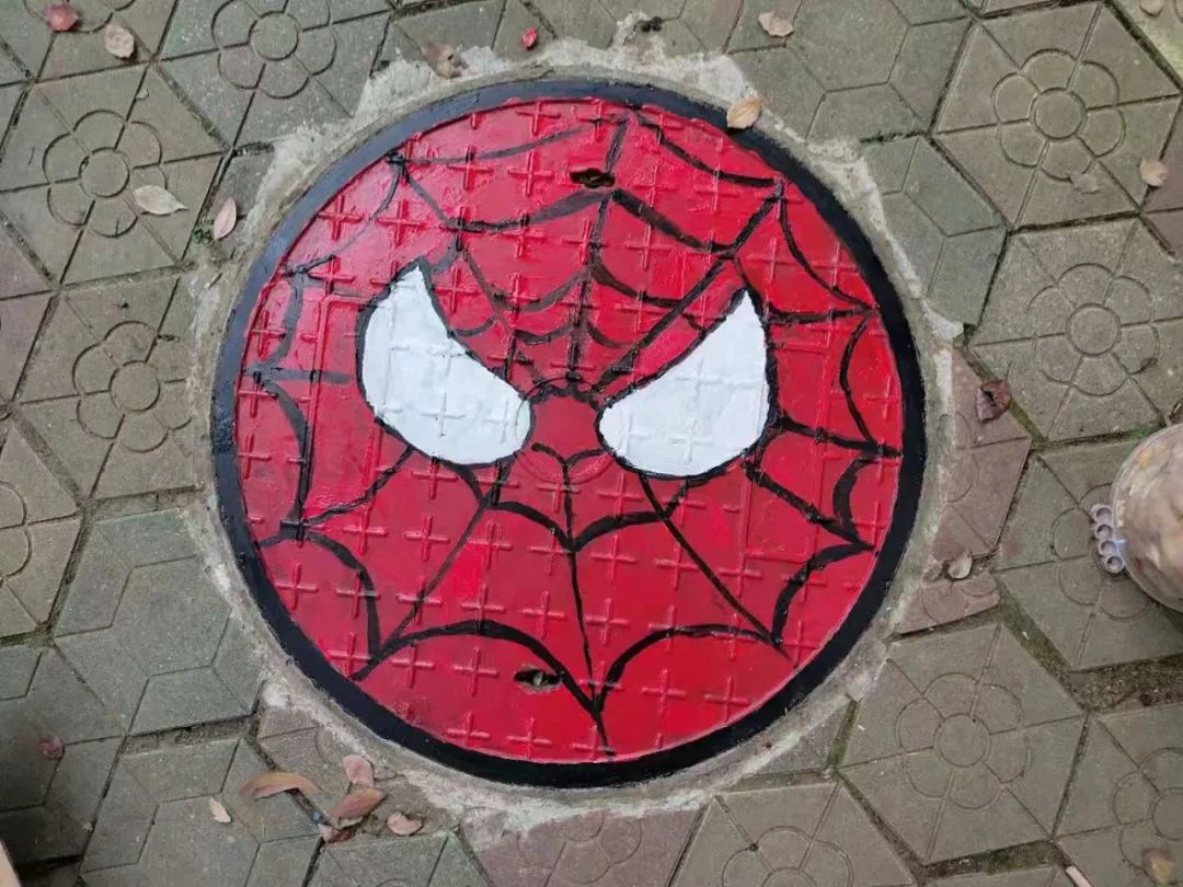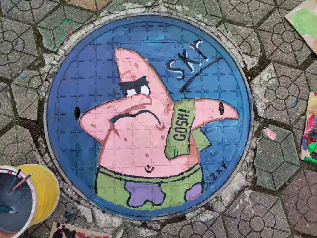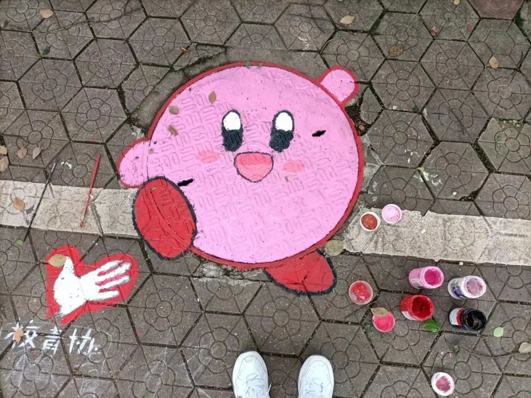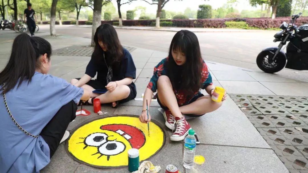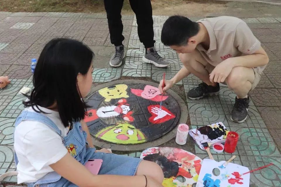 东华理工大学校园内,学生趁周末晴好天气为井盖化“妆”。