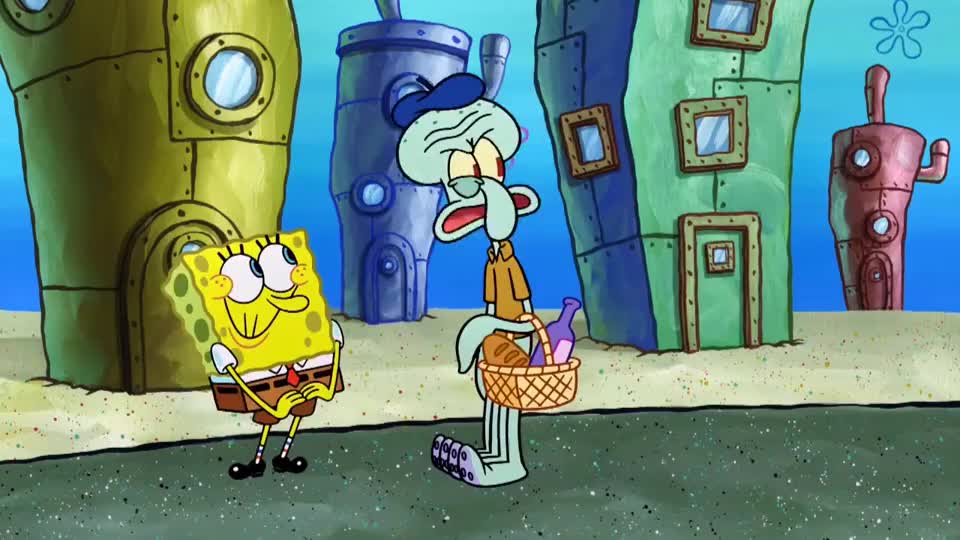 > 海绵宝宝练习亲亲小额头,可是小蜗没额头,只好亲眼睛