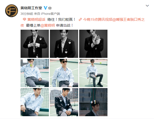 5月5日,黄晓明工作室分享了一组黄晓明帅气的照片,为即将开播的综艺节目《嘴强王者脱口秀之夜》宣传,并配上了鼓励的话语:“稳住!我们能赢!最懵上单@黄晓明 申请出战!”一时间也受到了网友们的广泛关注。