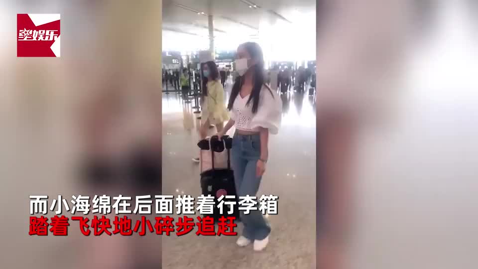 baby疑带儿子赶飞机,在前面一步三回头,小海绵推行李箱乖巧可爱
