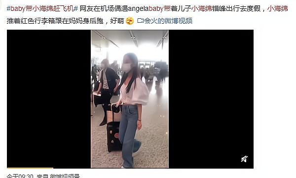 angelababy和小海绵因为赶飞机在机场一路狂奔,而小海绵在后面狂追妈妈,十分可爱。
